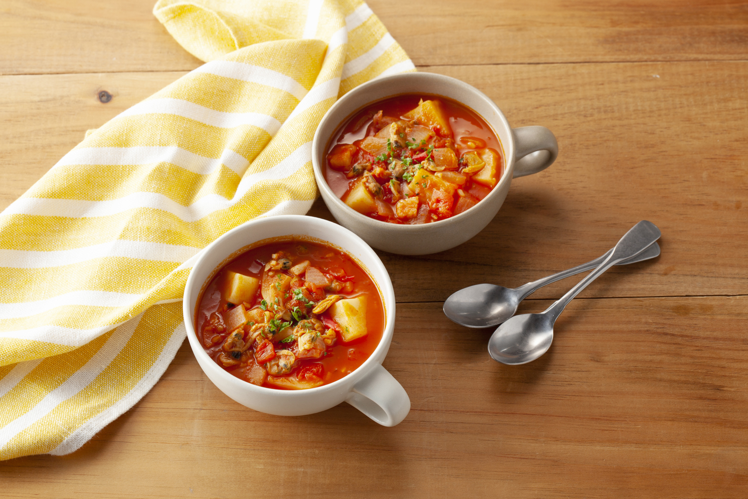❸トマトとトマトジュース、あさりの水煮(缶汁ごと)、水50mlを加え煮込む。アクを取りながら7~8分ほど煮て、じゃがいもがやわらかくなったら、塩、胡椒で味を調え、できあがり。お好みでパセリをふって召し上がれ♪