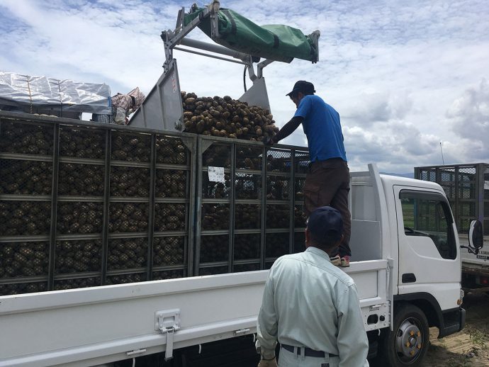 ↓今回取材の畑だけでも、約0.9ha、収穫見込みは27tだそうです。カルビーポテトのコンテナで単純計算すると、、、約20基もの収穫です!