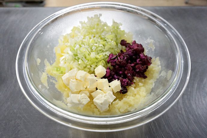 ❸みじん切りにした長ねぎと柴漬け、1cm角のクリームチーズを潰したじゃがいもにあわせます。