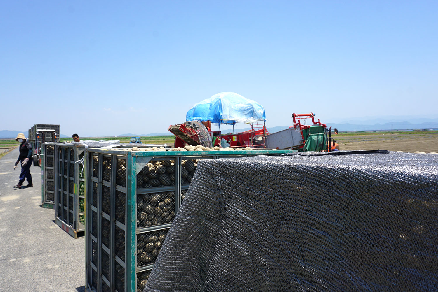 - お天気になってやっと収穫の時期が。立派なトヨシロがコンテナにたくさん収穫されて一安心ですね。