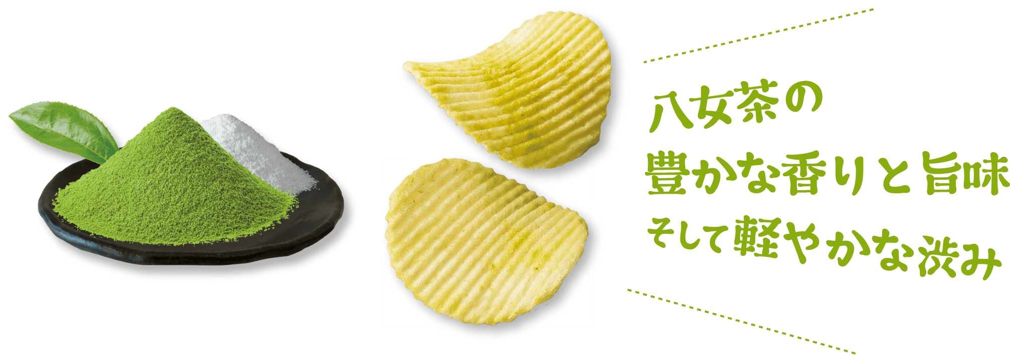 八女茶の豊かな香りと旨味、そして、軽やかな渋みが感じられる、絶妙な味わいのポテトチップスです。