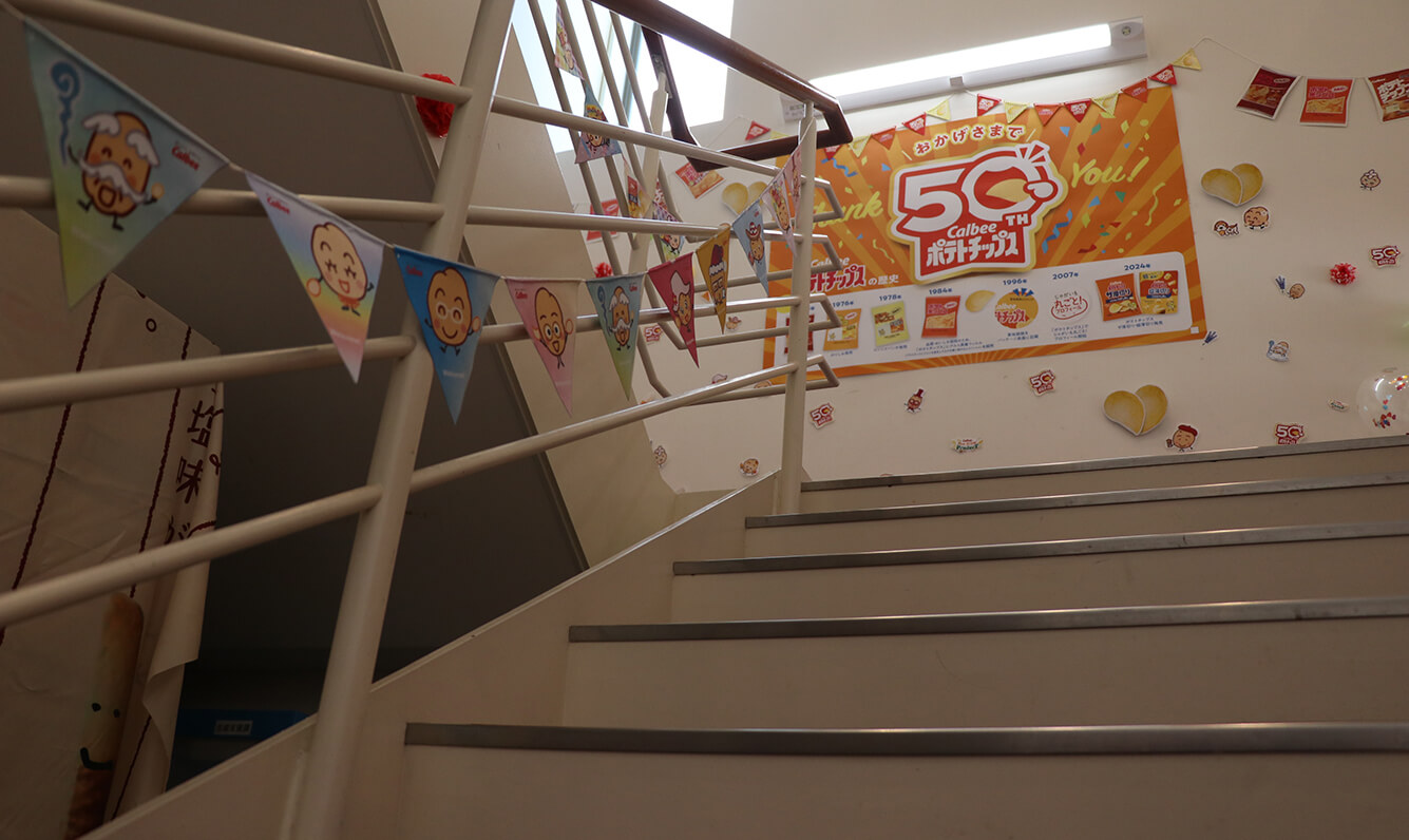 北海道工場ならではの工場見学とコンテンツを盛り込んだファンミーティング!当日は、カルビー公式アプリカルビールビープログラムから募集した約30名の「カルビーポテトチップス」ファンの皆さまに北海道工場にお集まりいただきました。工場スタッフがこだわって作成した「50周年をお祝いする記念撮影用スポット」、会議室の白い壁を埋め尽くすほどカルビー商品を使用したグラレーション背景は圧巻!入口から階段を上がるところにも遊び心たっぷりな仕掛けが隠されており、入口から早速撮影を始めるお客様も多くいらっしゃいました。