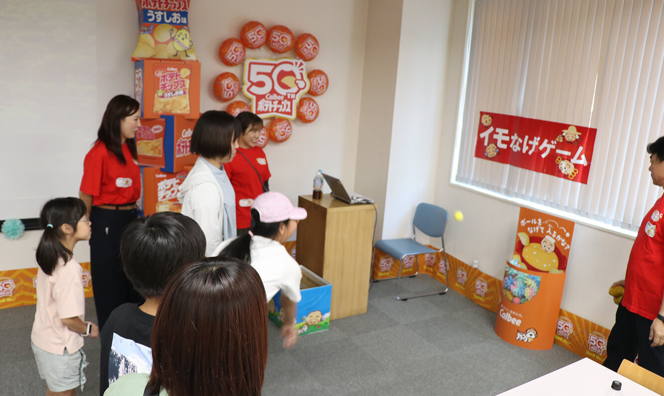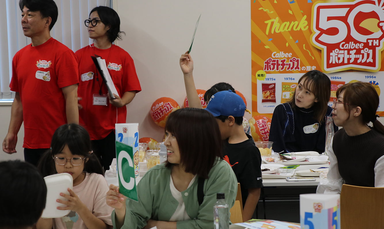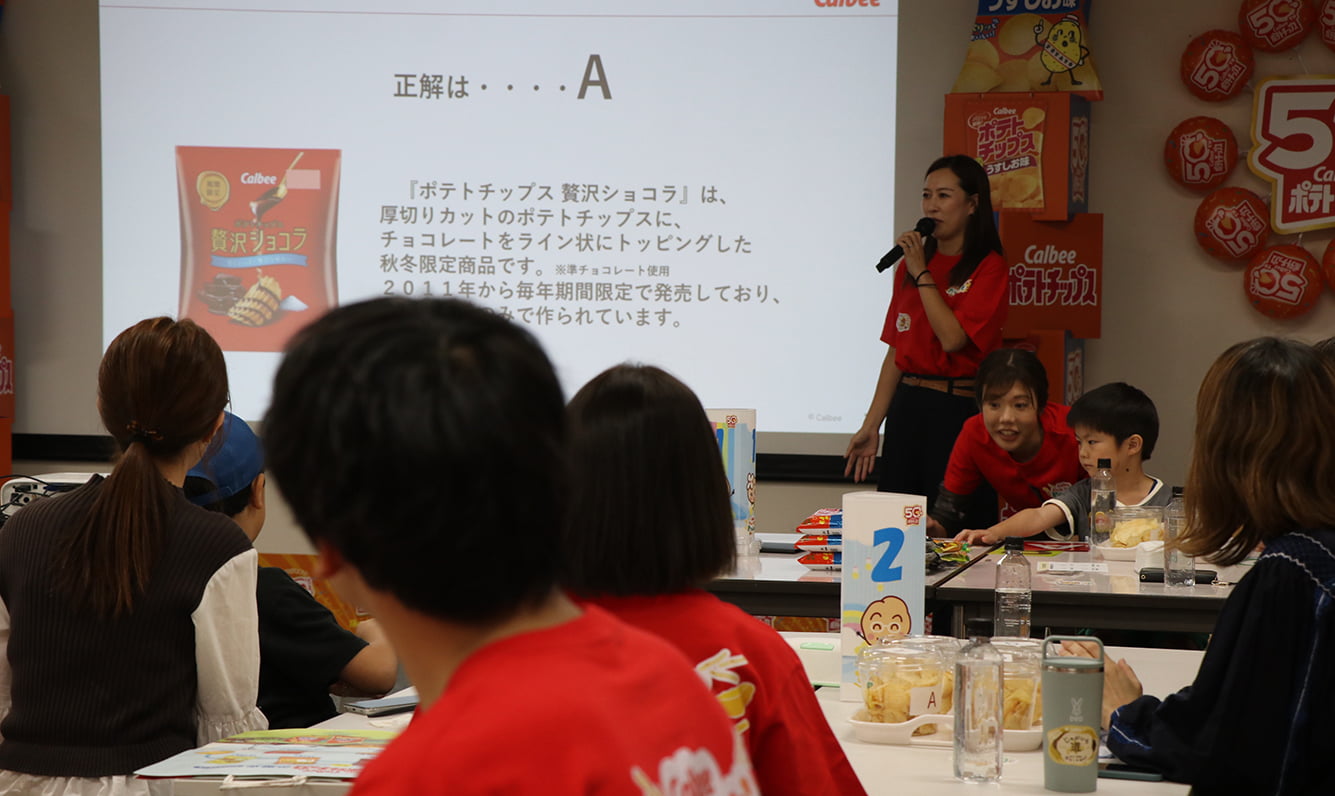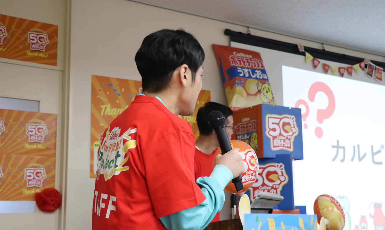 過去発売した商品やキャラクター、じゃがいもなどカルビーに関するクイズを出題。クイズに正解する度に歓声が上がりました。全問正解するチームも多く、たくさんの景品をGETしてもらいました。
