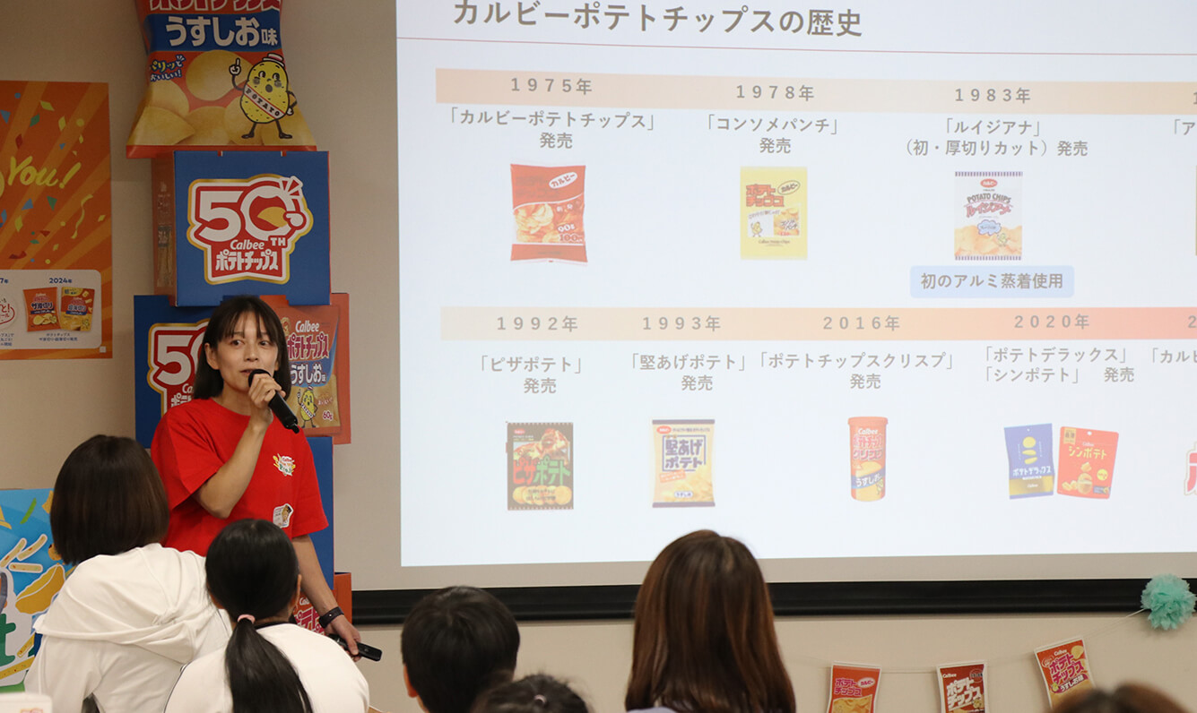 1975年発売のポテトチップスの歴史、味付け、製法、包材の進化によるおいしさの追求に関して説明しました。お話をまっすぐな目でみて聞いてくれる子どもたちが印象的でした。 -