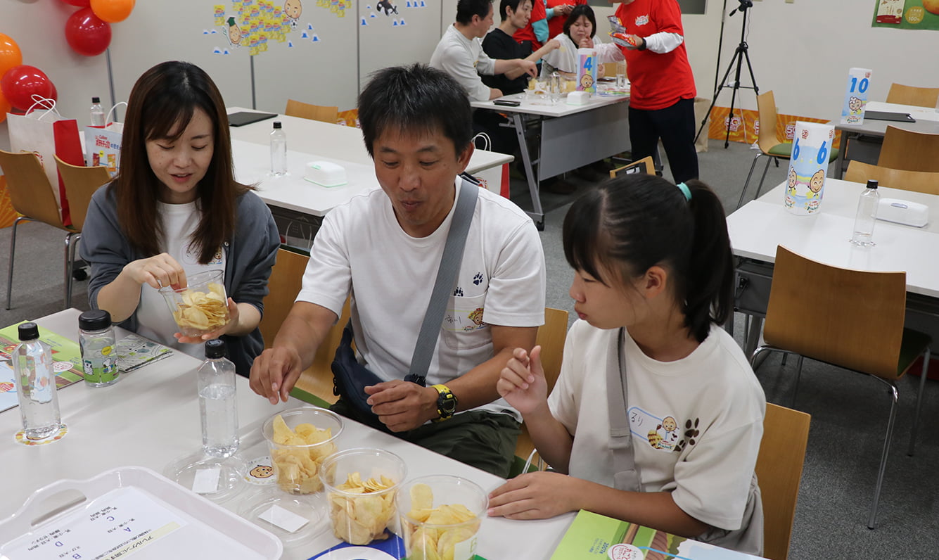 もうひとつのコンテンツはクイズ大会です!正解した問題数だけポテトチップスがもらえるという夢の企画。まず、はじめに地域限定の味わい4種類(北海道バターしょうゆ味、東海えびしお味、関西だししょうゆ、九州しょうゆ)を食べ比べして、ポテトチップス北海道バターしょうゆ味はどれか当てるクイズを実施しました。4種類すべての味わいを正解するチームも多数あり普段なかなか食べられない地域の味を楽しんでいただきました。