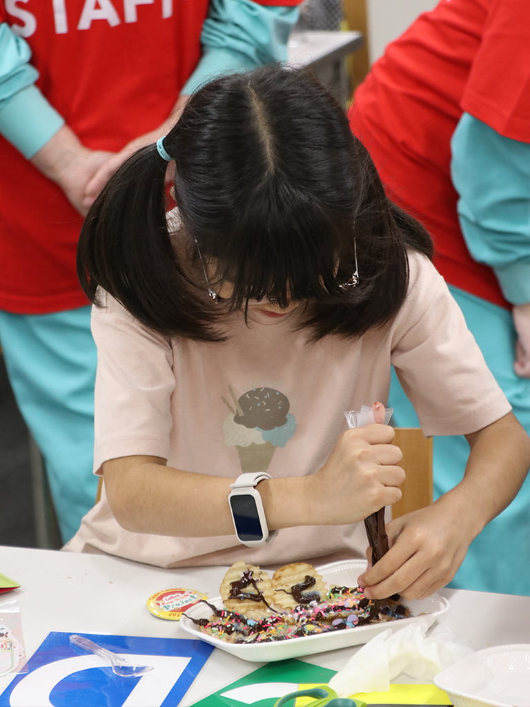 デコレーションで使用したチョコレートは実際に工場で使用しているチョコレート!オリジナルのチョコ掛けポテトチップス作りで思い思いの「渾身の1枚」を作り上げていただきました。自分で作ったチョコ掛けポテトチップスの味は、大好きなチョコスプレーをたっぷりトッピングしたりキラキラをのせて可愛く仕上げたり、世界にひとつだけの唯一無二なおいしさに思わず笑みがこぼれます。