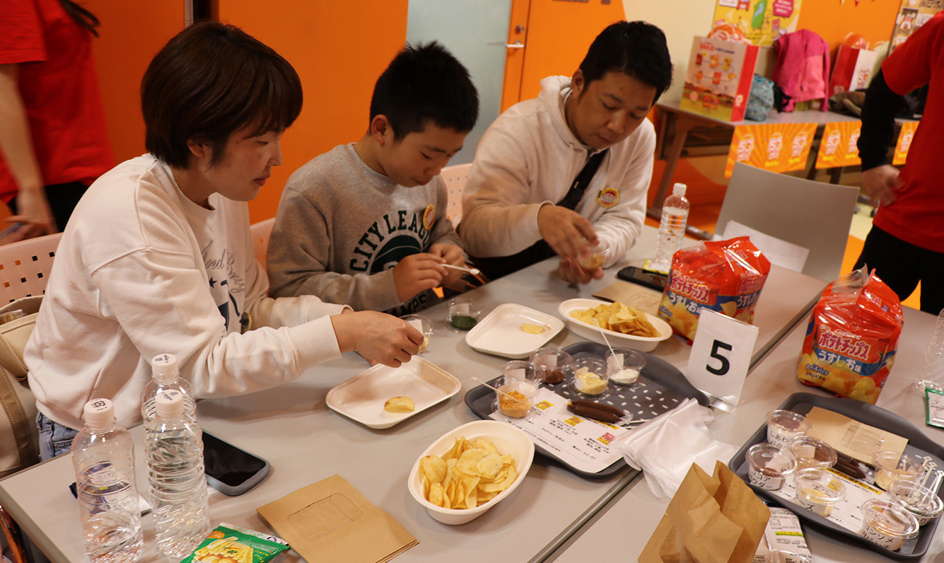 実際に生産に使用している工場推しのフレーバー3種類に、厳選した6種類の市販調味料で自由に味付けを楽しんでいただきます。最初に登場するのは、製造したばかりのできたてポテトチップス。スタッフが参加者のテーブルにフラットと厚切りの2種類のポテトチップスを運んでいきます。普段食べることのできない味わいについつい手が伸びていきます。