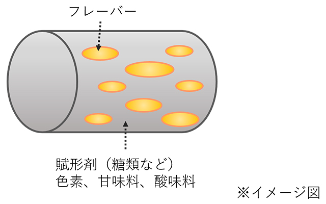 「フリス®」は、香料メーカーの高砂香料工業株式会社の登録商標です。粒が大きめで色を付けられるため、ガムやタブレットに用いられることが多い、カプセル化した香料です。口の中に入った後に、カプセルに閉じ込めた香りが押し寄せることが特長で、「ス―パーポテト」では、ポテトチップスに合うように独自開発したバター風味の「フリス®」を使用しています。