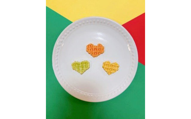 中身の3色のスナックは、かわいらしいハート型で、緑黄色野菜をおいしく楽しく食べられます。スナックの中には、大きさ約2倍の「おっきいハート」(赤色のみ)がまれに入っており、親子で探す楽しさや見つけたときにハッピー!な気持ちになれるなどとご好評をいただいています。