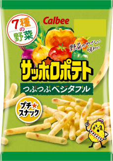 じゃがいも+7種の野菜を生地に練り込んで、時間をかけて丁寧に作っています。見た目にも楽しい野菜のつぶつぶ入りで、野菜のやさしい味わいが楽しめる、飽きのこないスナックです。