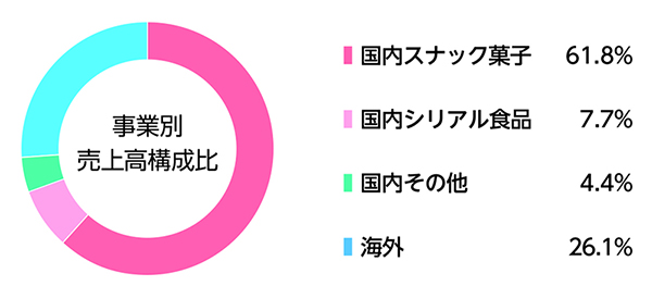 国内事業については、原材料費、動力費等のコスト高騰に対して、スナック菓子は段階的に価格改定を実施しました。改定後もプロモーション、そしてリニューアル等を⾏うことで、お客様の購買需要を喚起し、ポテトチップス、じゃがりこを中⼼に好調に推移しました。また、旅⾏者の増加により⼟産⽤のスナック菓子も増収となりました。