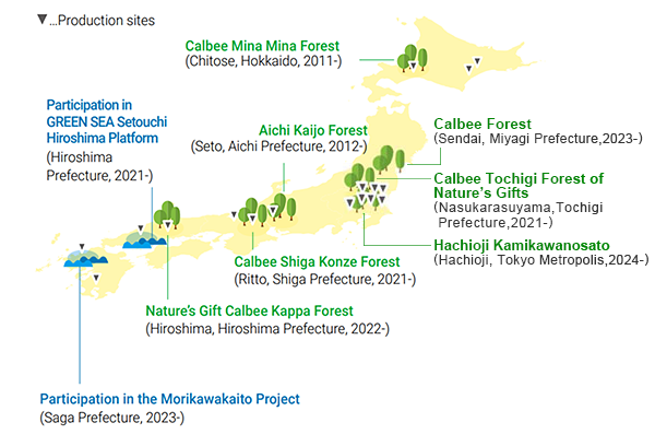The Calbee Group utilizes a large amount of potatoes, nature's gift. Growing potatoes requires a large amount of water. The Calbee Group engages in forest protection activities in the Calbee Mina Mina Forest (Chitose, Hokkaido), Calbee Forest (Sendai, Miyagi Prefecture), Calbee Tochigi Nature’s Gift Forest (Nasukarasuyama, Tochigi Prefecture), Aichi Kaisho Forest (Seto, Aichi Prefecture), Calbee Shiga Konze Forest (Ritto, Shiga Prefecture), and Nature’s Gift Calbee Kappa Forest (Hiroshima, Hiroshima Prefecture) with the aim of developing and maintaining sustainable water resources and promoting forest development in disaster-afflicted areas. These activities are carried out by the employees themselves, which serves to remind them of the gifts of nature and of the responsibilities involved in using precious groundwater. In 2024, the Group participated in the Hachioji Kamikawanosato, a project to maintain and promote the use of forests in Hachioji, Tokyo.
