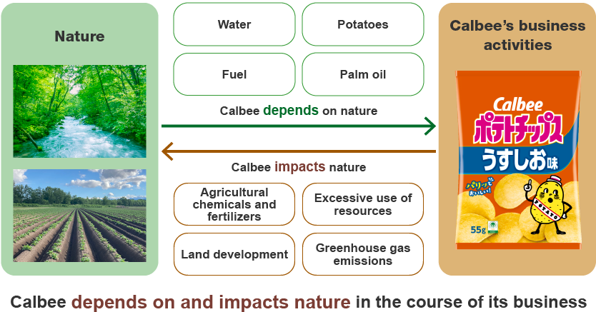 The Calbee Group both depends on and impacts nature in the form of natural capital throughout its supply chain. Calbee’s Potato Chips products are dependent on nature for raw materials, such as potatoes and palm oil, as well as the fuel and water used in the production process. Our business activities also have an impact on the environment, including the use of pesticides and fertilizers in potato cultivation, the use of plastics made from petroleum resources, land development, and greenhouse gas emissions.