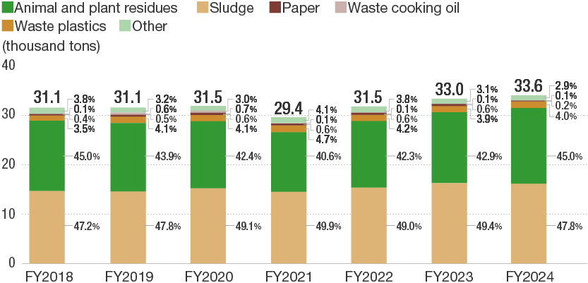 The first priority of the Calbee Group is to produce products that conform to quality standards and to prevent losses.We are striving to reduce waste by reducing the volume of waste generated in the production process through drying, etc., and reusing it as a high-value-added resource (turning it into valuable resources). Regarding sludge, animal and plant residues*, and waste plastics, which are particularly high in emissions, the internal Waste Committee will lead the implementation and continuation of these initiatives.