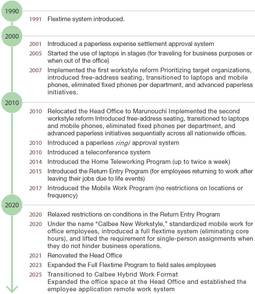 In 2025, Calbee transitioned to a hybrid work format, which flexibly combines mobile work and working in the office, enabling employees to independently choose the location and time of their work by working backward from the objectives and outputs of their jobs.
