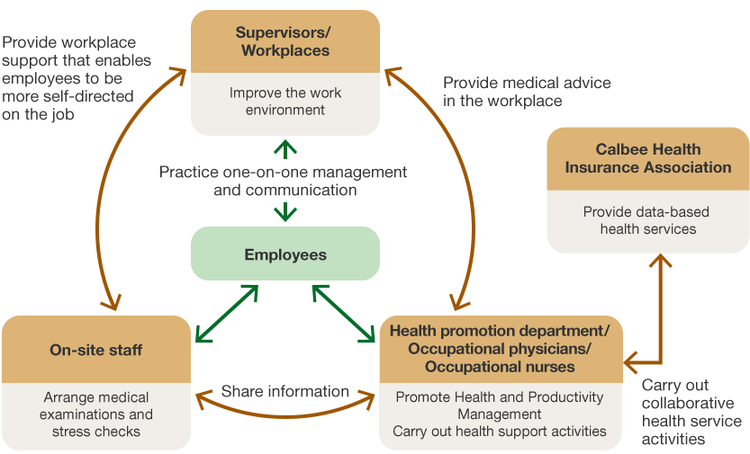 The health promotion department, based on the Calbee Group Health Declaration, plays the central role in driving forward the Group’s health and productivity management. Supervisors and workplaces, on-site staff, occupational physicians and nurses, and the Calbee Health Insurance Association collaborate to build a mechanism that allows every employee to excel on the job.