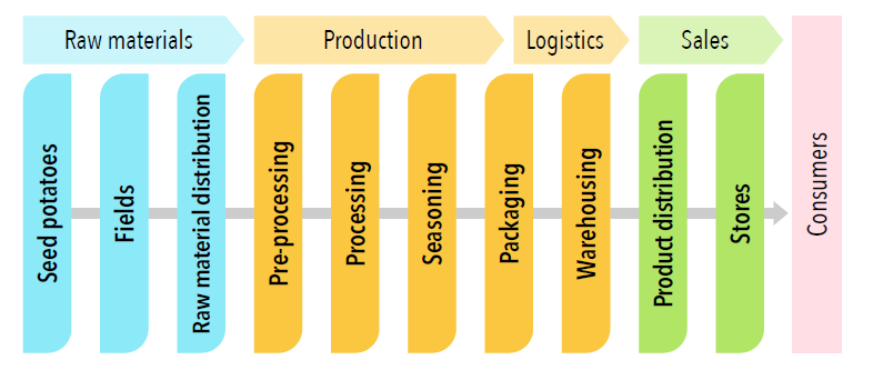 Calbee’s unique 10 Processes value chain sets forth standards to ensure that each process guarantees 100% quality to the subsequent process. The linking of these processes enables us to achieve full quality assurance of all products and provide traceability for our customers.