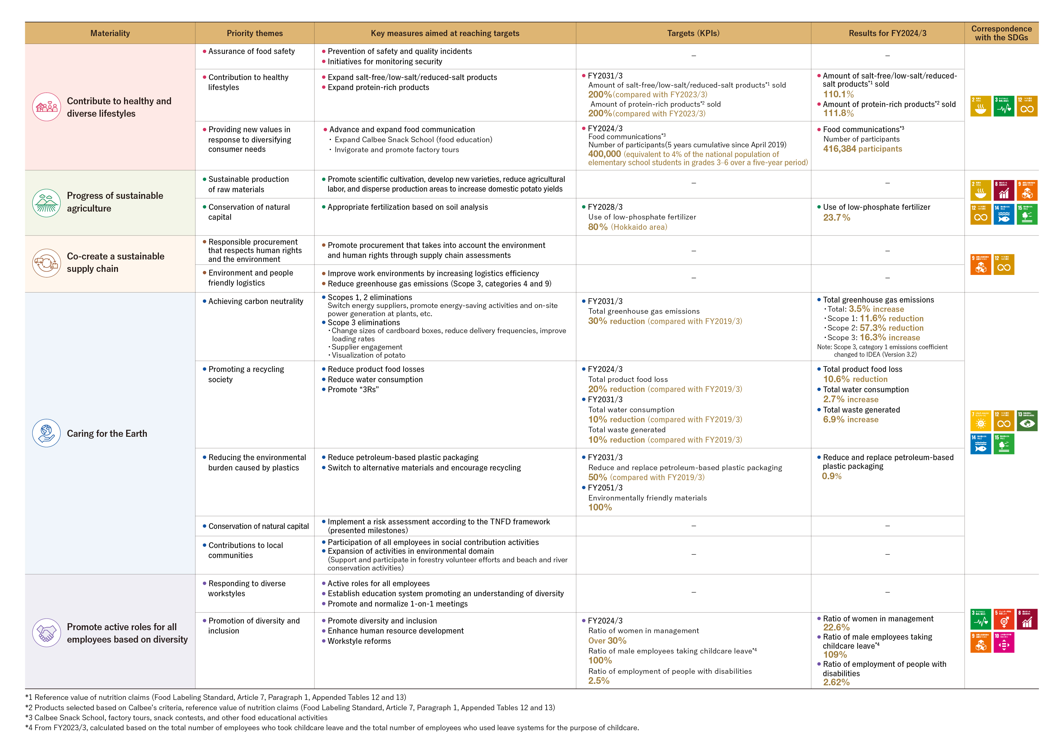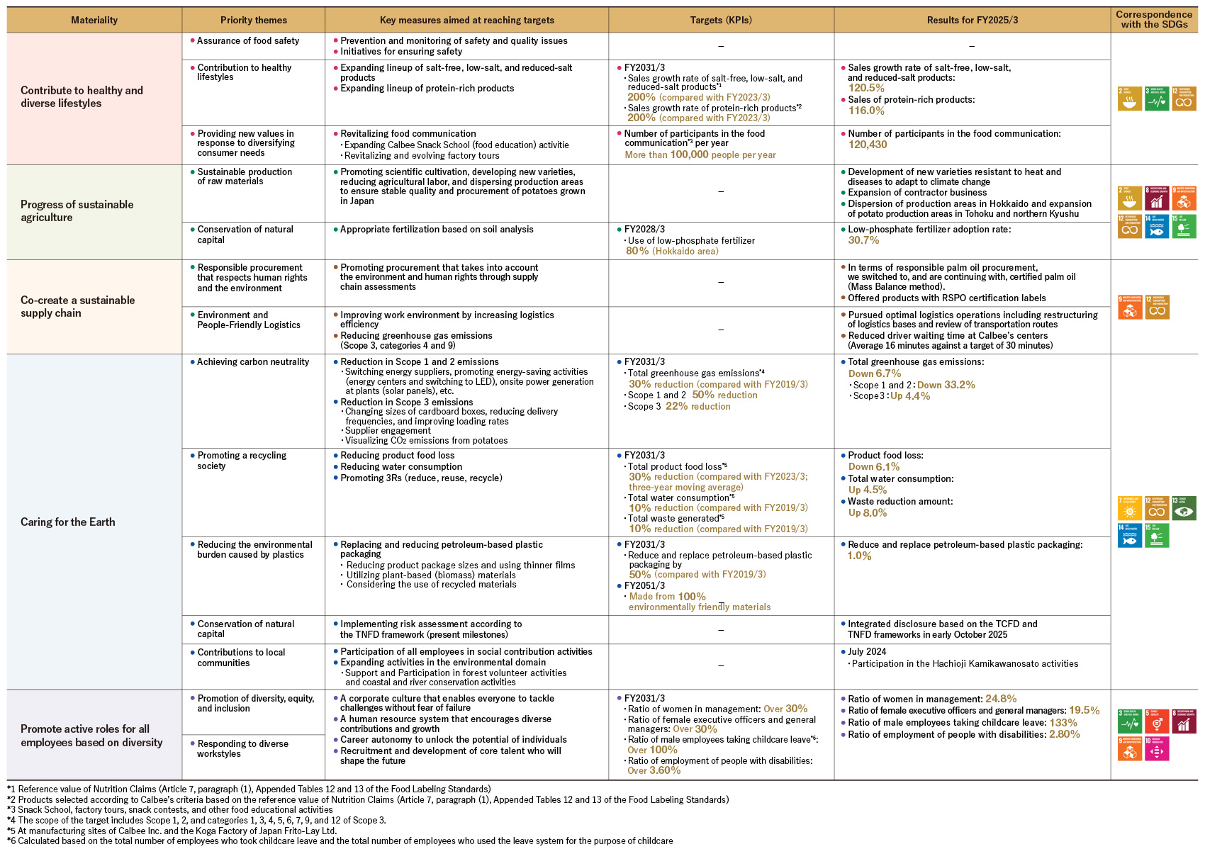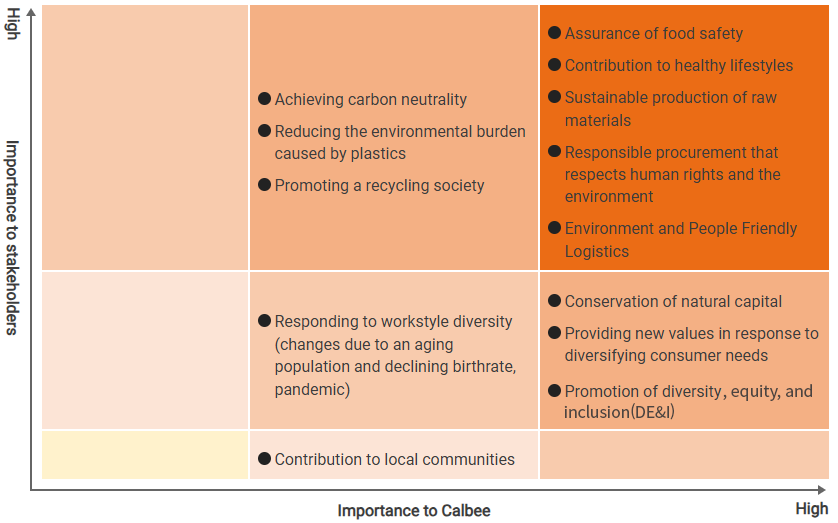 The Calbee Group is addressing priority themes identified based on materiality (key issues), which is the central strategy of its sustainability management.