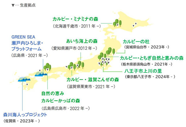 カルビーグループは自然の恵みであるじゃがいもを多く使用しています。そのじゃがいもを栽培するのに大量の水が必要です。そこで、カルビーグループでは「カルビー・ミナミナの森」(北海道千歳市)、「カルビーの杜」(宮城県仙台市)、「カルビー・とちぎ自然と恵みの森」(栃木県那須烏山市)、「あいち海上の森」(愛知県瀬戸市)、「カルビー・滋賀こんぜの森」(滋賀県栗東市)、「自然の恵み カルビーかっぱの森」(広島県広島市)において森林保全活動に取り組み、持続可能な水源涵養機能の維持・向上や被災地の森林づくりの推進を目指しています。活動は従業員自らが行い、自然の恵みを再認識し、貴重な地下水を利用する責任を考える機会になっています。また、2024年には東京都八王子市において里山の維持管理や利活用を進めるため「八王子市上川の里」(東京都八王子市)への参画も始めました。