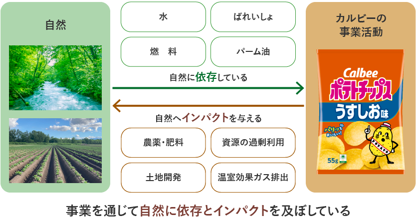 カルビーグループは、事業のサプライチェーン全体を通じて自然資本からの自然の恵みに依存し、インパクトを与えています。カルビーのポテトチップス製造においては、ばれいしょ・パーム油などの自然の恵みである原材料や、製造過程で使用する燃料や水など自然に依存しています。また、ばれいしょ栽培で使用する農薬や肥料、石油資源からつくられるプラスチックの利用、土地開発、温室効果ガスの排出など事業を通じて自然へインパクトを与えています。
